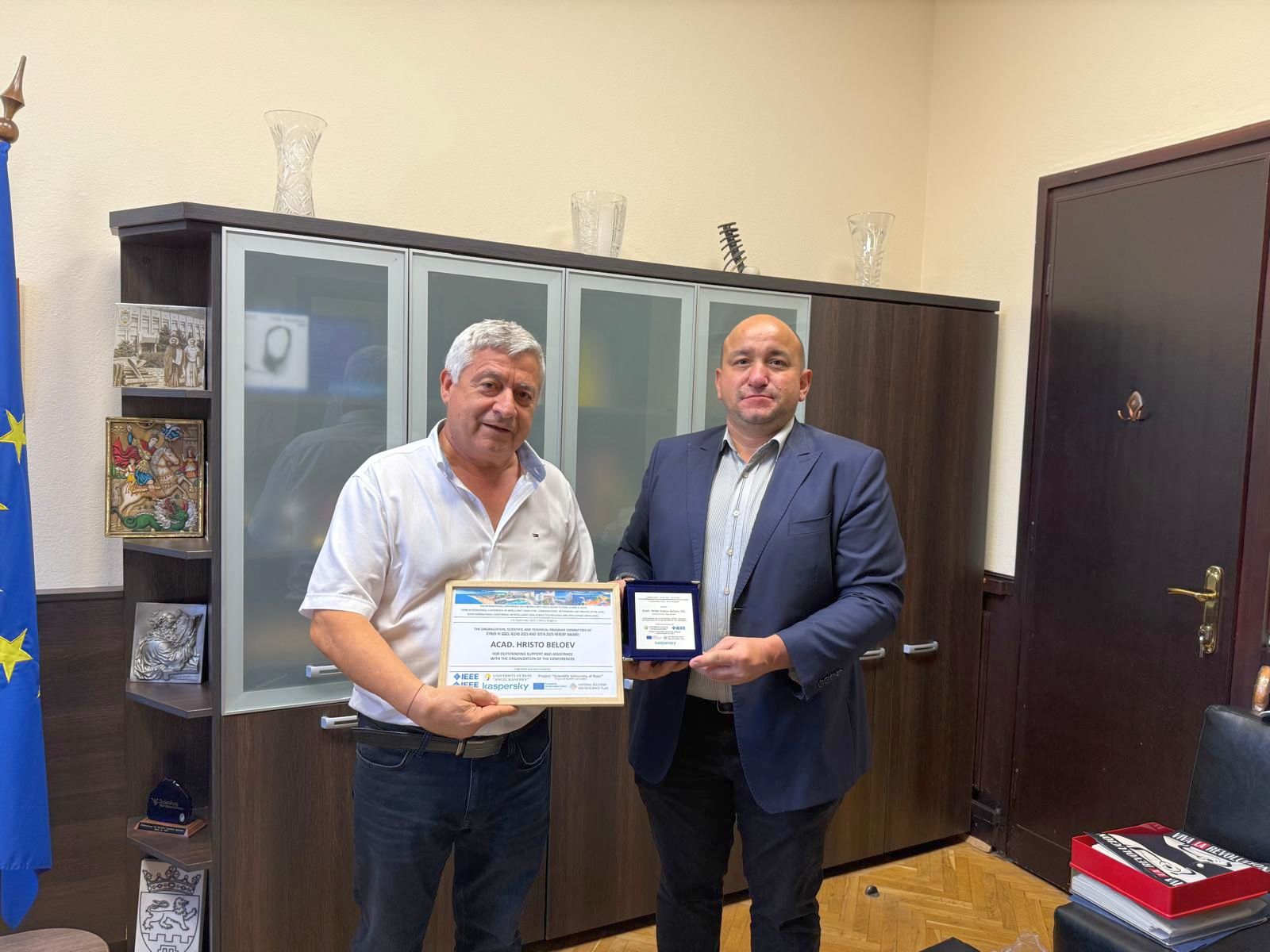 During their visit, the lecturers from the Kingdom of Jordan met with the Rector of Ruse the University of Ruse, Associate Professor Desislava Atanasova, PhD and the Honourary Rector and Chairman of the General Assembly of the University, Academician Hristo Beloev, DscEng who were awarded plaques of gratitude for the long-standing cooperation between the two institutions and for the support of the University of Ruse in organizing and conducting the international scientific conferences CYBER-AI 2025, ICCNS 2025, and IDSTA 2025.